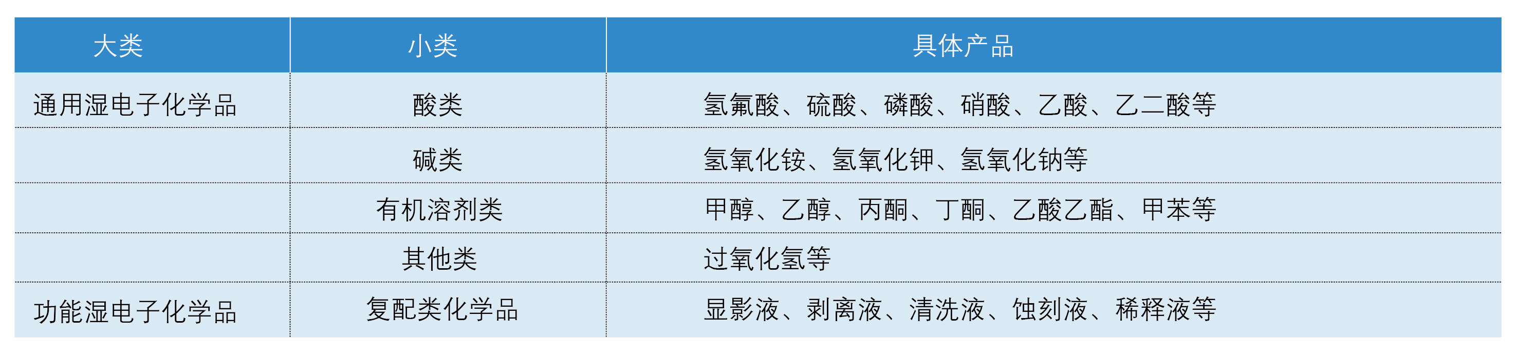 根據觀研報告網發布的《中國濕電子化學品市場發展態勢分析與投資戰略預測報告(2023-2030年)》顯示,從大類來分,一般可劃分為通用濕電子化學品和功能濕電子化學品。根據中國電子材料行業協會數據,通用濕電子化學品占比88.2%,其中過氧化氫占比16.7%,氫氟酸占比16%,硫酸占比15.3%,硝酸占比14.3%。功能濕電子化學品占比11.8%,其中MEA等極性溶液占比3.2%,顯影液(半導體用)占比2.7%,蝕刻液(半導體用)占比2.2%。